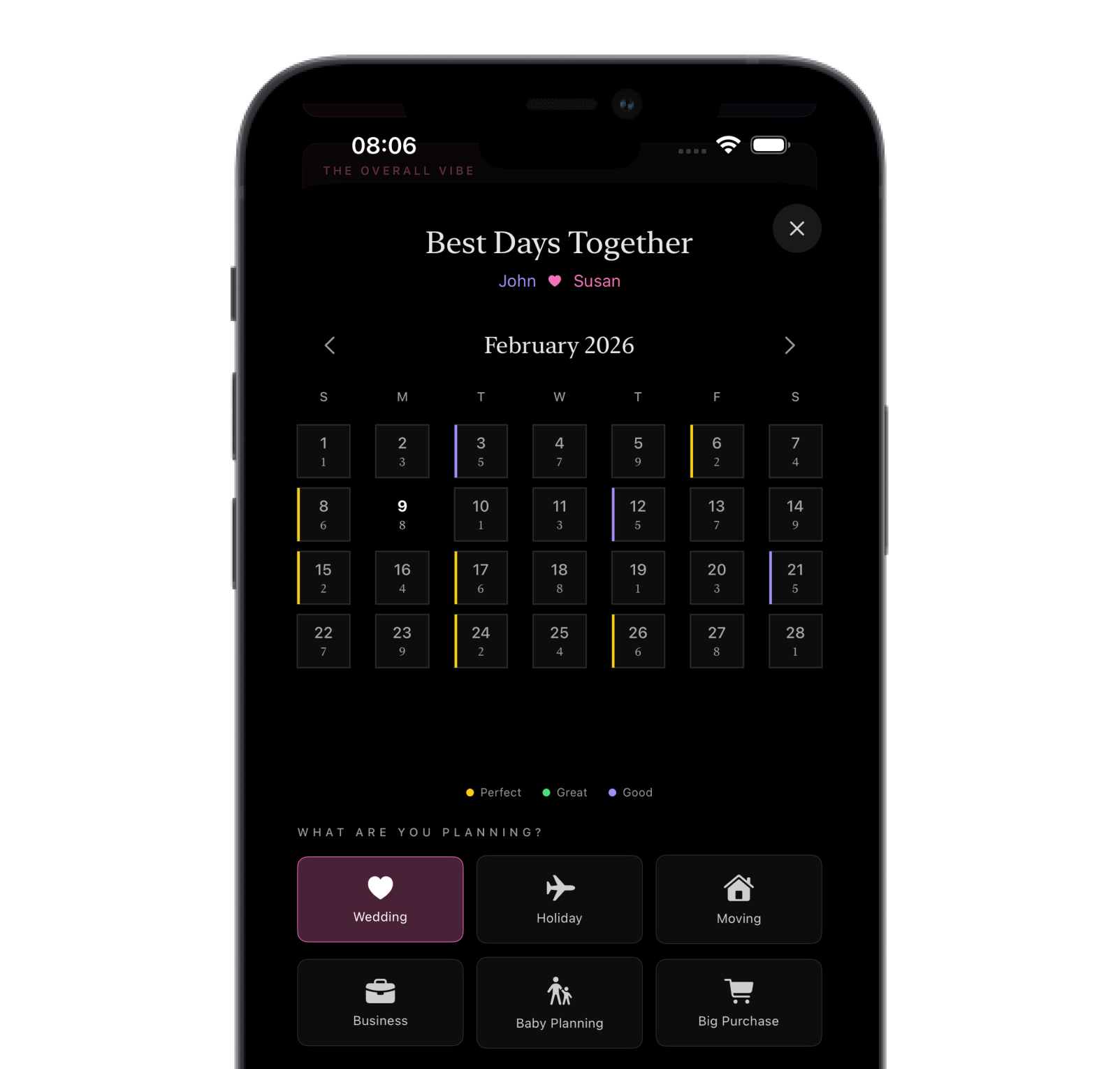Planning your big day? We analyze both partners' energies to find dates when love, harmony, and commitment align perfectly. Choose a wedding date written in the stars — and the numbers.